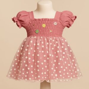 Charming pink floral frock with flutter sleeves and daisy embellishments